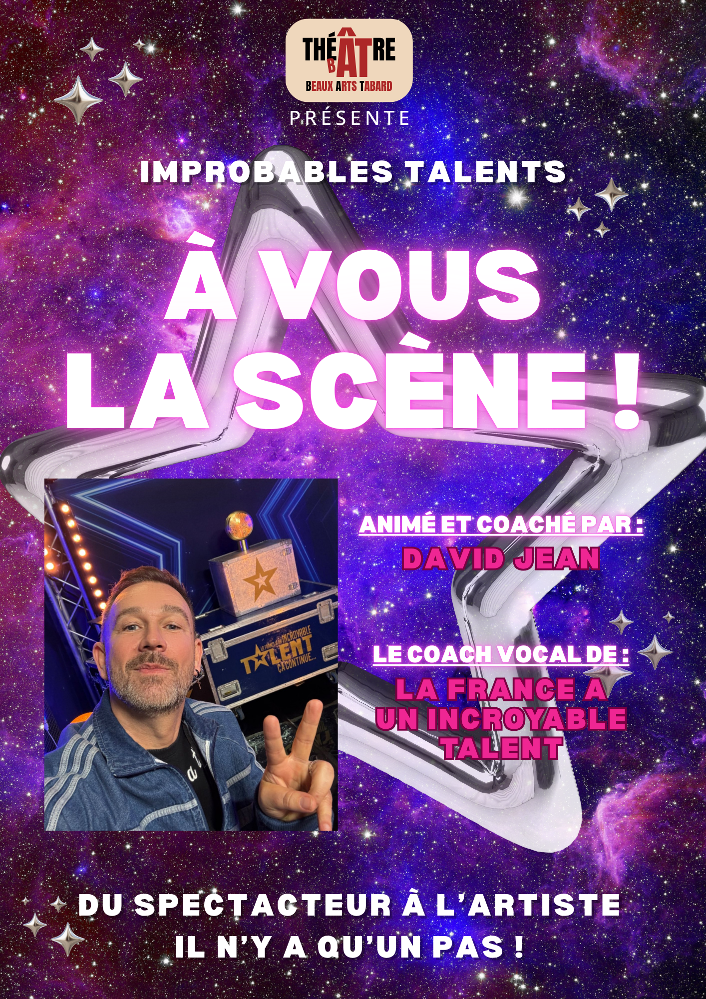 Dans cette aventure, vous serez guidé par David JEAN, Chanteur, Comédien, Auteur/Compositeur ou encore metteur en scène dans le domaine de la Comédie Musicale. Mais aussi, Coach Vocal de « La France a un Incroyable Talent » M6 depuis 15 ans, « Prodiges » France 2, « N’oubliez pas les enfants » France 2.
